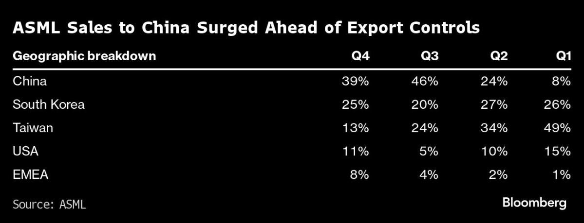 China accounted for 39% of ASML’s sales in the fourth quarter and became the Veldhoven-based company’s largest market in 2023. China accounted for only 8% in January to March.