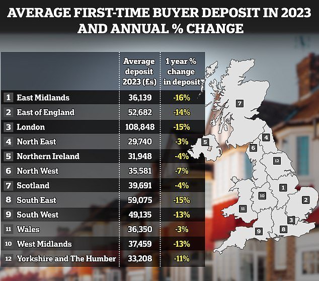 The biggest fall for the amount of deposit required to buy a house was 16 per cent in the East Midlands, at £36,139.