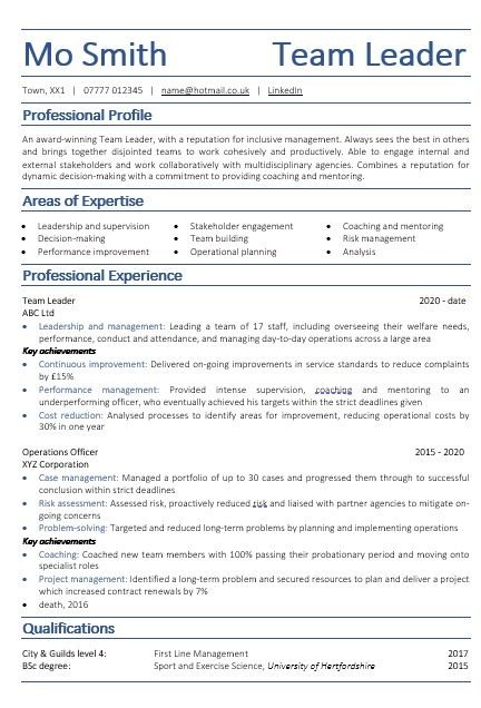 If you’re not yet in a management role, demonstrate the skills and experience you have that proves you’re ready to step up. Start with a brief outline of your role and use the achievements section to show how you’ve gone beyond the basic requirements. Maybe you’ve managed a project or event, trained new staff or deputised for your manager? Consider what you’ve done that qualifies you for a management role.