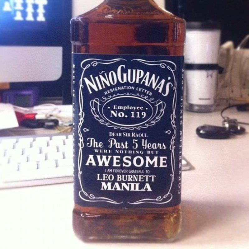 A resignation letter on the label of a Jack Daniels bottle