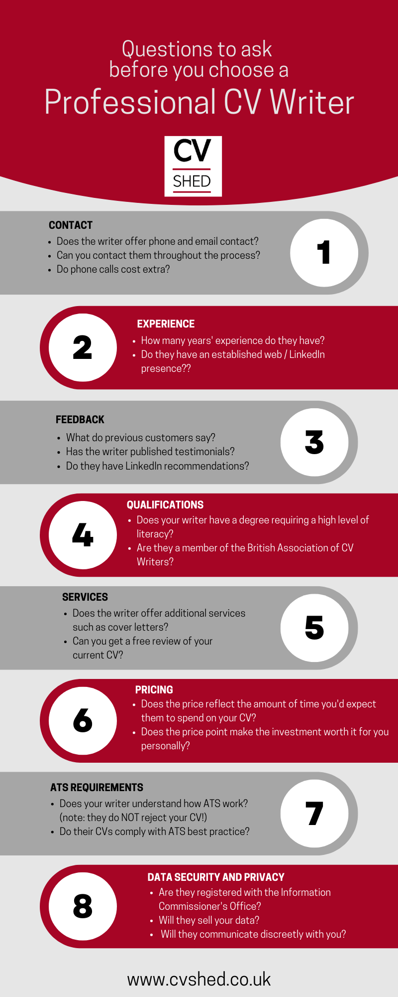 For anyone thinking of starting a job search, engaging a professional CV writer can be a worthwhile exercise. But there are so many out there! How can you choose the one that best meets your needs? This infographic explains the questions to ask a CV writer, and the research you need to do, to make sure that your CV writer is capable of producing high-quality job search documents for you.