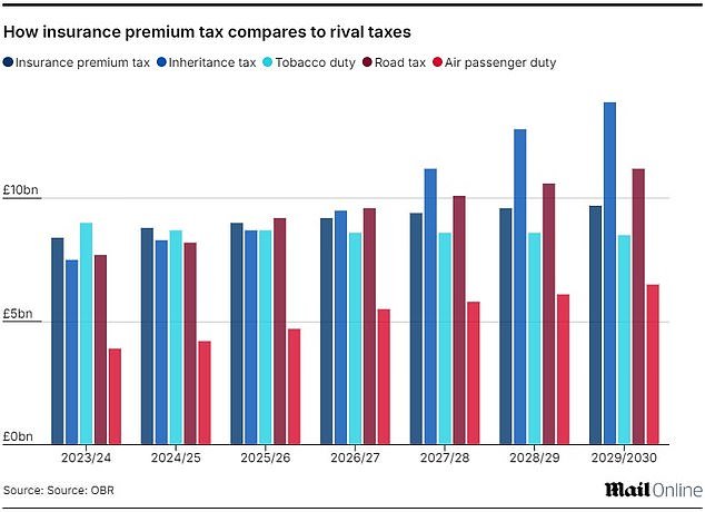The OBR predicted IPT will rake in £42.4billion over the next five years at the time of the 2024 spring Budget, but has now upgraded that to £46billion.