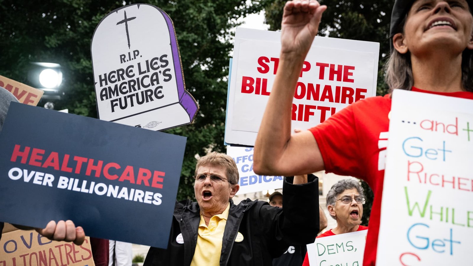 Demonstrators hold signs during a rally for healthcare funding outside the US Capitol in Washington, DC, on Sept. 30, 2025.