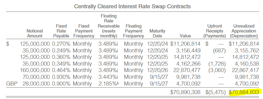 Most of this was fixed-rate due to interest rate swaps where the offset comes in the form of capital appreciation. In the last annual report, which is a bit dated at this point, we saw they were sitting on nearly $71 million in unrealized appreciation on their interest rate swaps.