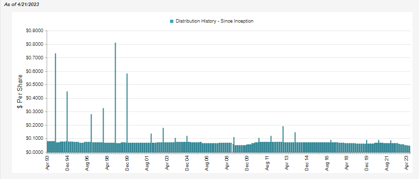 To briefly recap, it’s simply due to the higher interest rates and the fact that they chose not to hedge for higher rates. As long as the Fed is raising rates, which is expected in May, these funds will continue to cut their distributions. While the fund has adjusted its distributions historically, we haven’t had an increase in interest rates as fast as the one we saw last year in decades. This is an old fund, but it hasn’t experienced anything like this previously, even with its early 1990s inception. Therefore, the distribution cuts have been coming just as fast and furious as the Fed was doling out hikes.