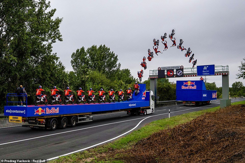 From the bed of a truck moving at 12mph, the 27-year-old from Mühlhausen in Germany accelerates his KTM motorcycle to 54mph before launching off a ramp into the air at a combined speed of 46mph. Mid-flight, Ackermann then performs a jaw-dropping ‘Tsunami Backflip’ while clearing a nine-metre-high barrier like you would see on a UK smart motorway